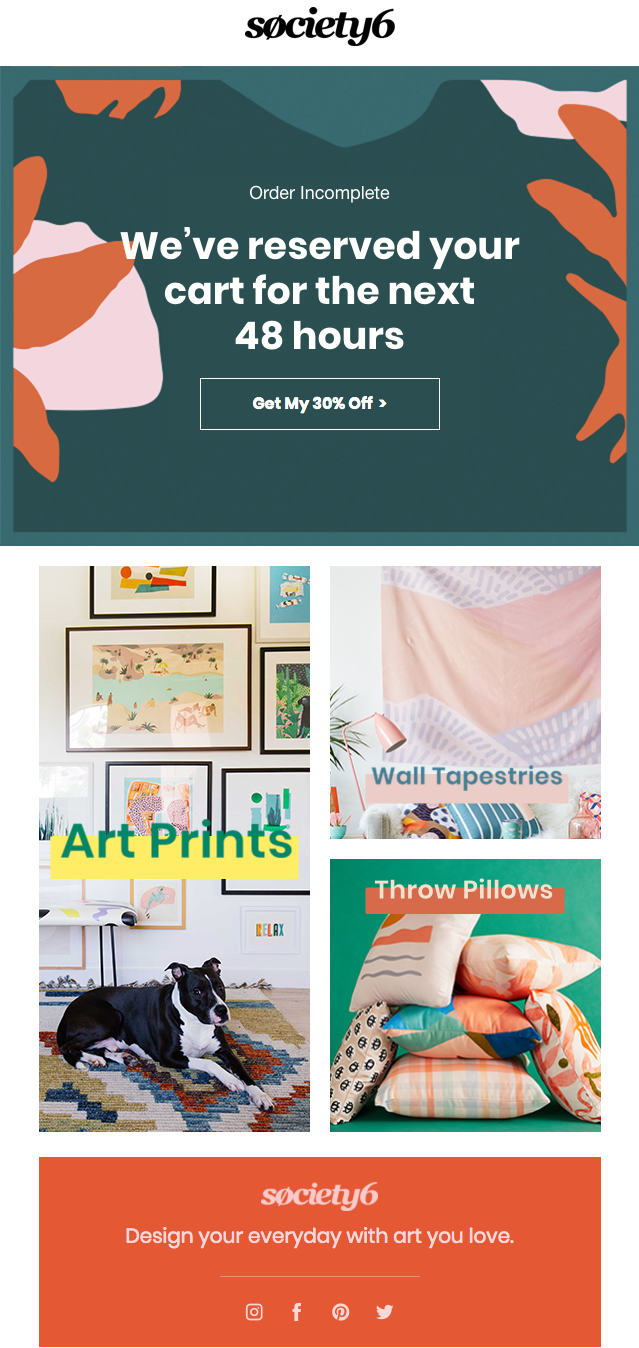 The reason why Society6 aced their abandoned cart email design was that designing is their thing.